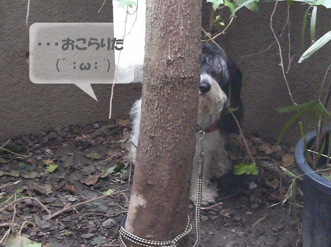 ケージの掃除やら粗相の片付けをしている間中、エディは木の陰から顔を半分だけ覗かせてこちらの様子を窺っていた。