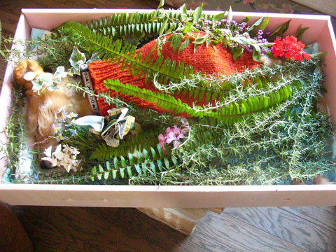 ひとしきり泣いた後、ダンボールに入れて庭に咲いている花とハーブで飾った。祖母が編んでくれたセーターも入れ、ジョン爺さんが喉に詰めるほど好きだった骨も入れた。