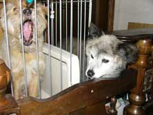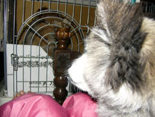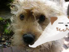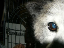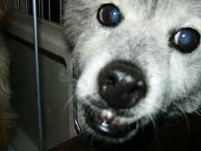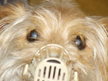 ジョン君の口輪装着図。なんだか「ナウ●カ」に出てくるマスクみたいです。『シューシュー』言ってるし。「ぐ~~~