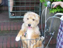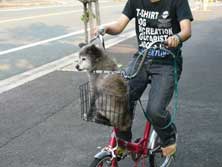 自転車の前かごに入れられたジニー。かなりドキドキしていますが、それなりに楽しんでいるようです。こっち(セト・おさる)はドキドキしっぱなしでした
