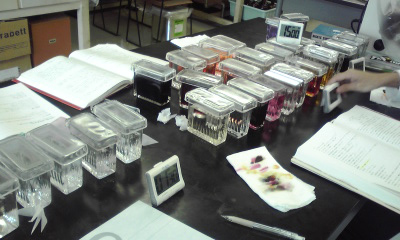組織切片(臓器をうすーーくスライスしたもの)をひたすら色水につけて染めていってます。